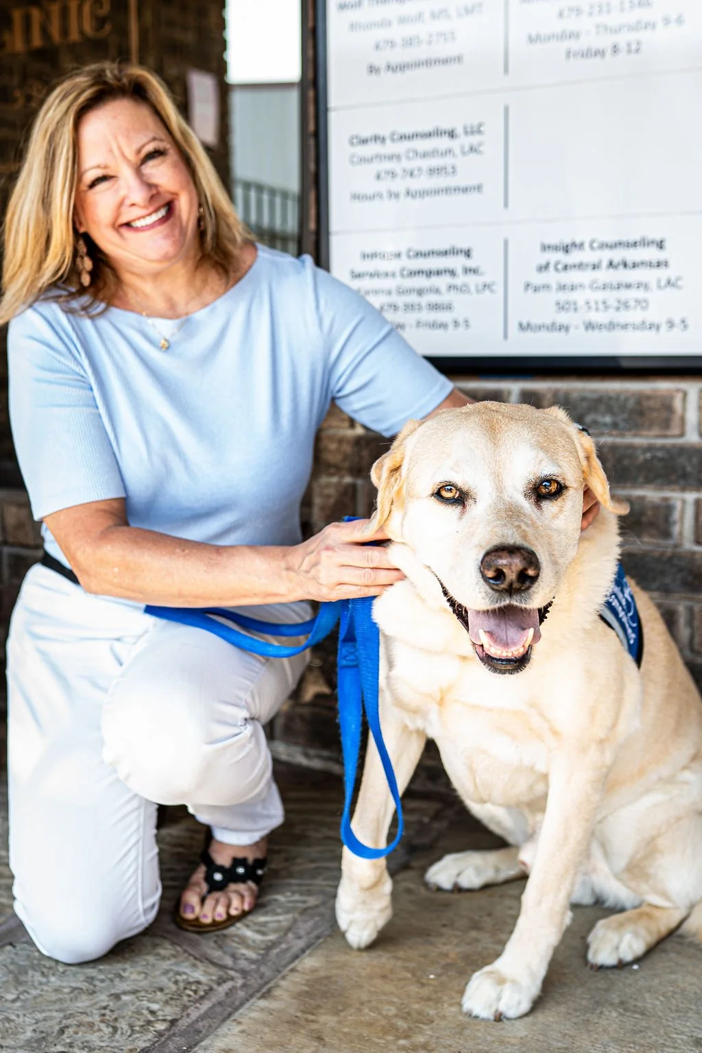 I completed my undergraduate studies in Psychology at Arkansas Tech University in 2009 and earned my Master of Science in Marriage and Family Therapy from John Brown University in 2013. I am deeply passionate about my work and feel honored to do this each day. I am joined by my highly trained facility dog, Mitchell, whose calm presence helps create a sense of safety and comfort in the therapy space. I also work alongside my husband, Gregory, who serves as my office manager.